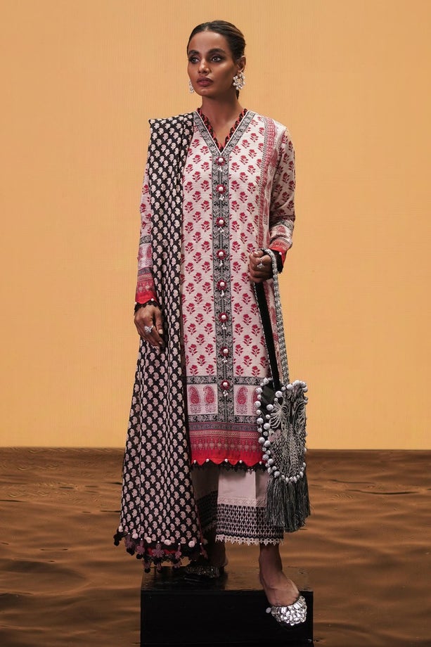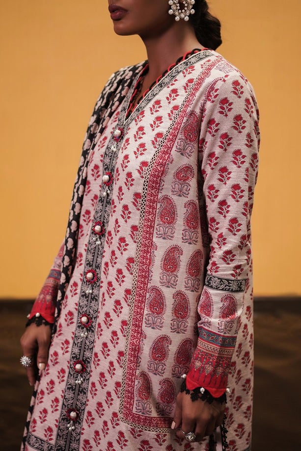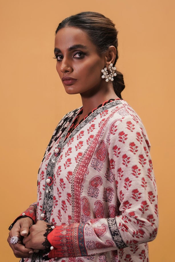 A gorgeous digitally printed beige shirt in block-print style. This outfit is finished off with a beautiful rotary-printed khaddar dupatta in contrasting colours and cambric pants.