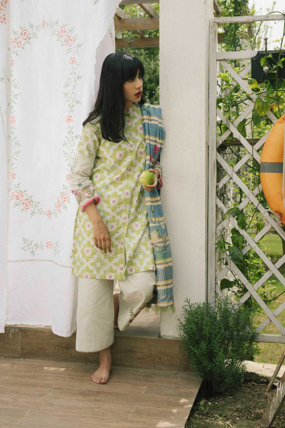 paired with a printed jacquard dupatta and dyed cambric trouser and an additional embroidery patch.