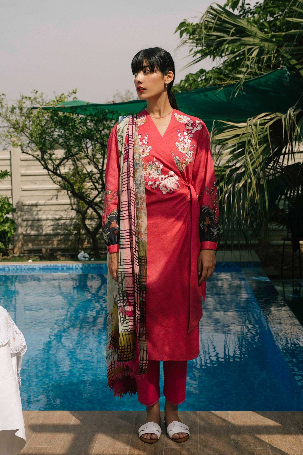 paired with a printed chiffon dupatta with an additional embroidered neck patch and dyed cambric trouser.
