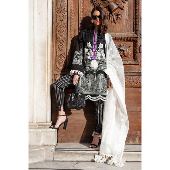A monochrome embroidered subcontinent inspired set shirt with printed monochrome sleeves, back and border on a black lawn base. Paired with a white jacquard woven dupatta and a cotton printed shalwar.