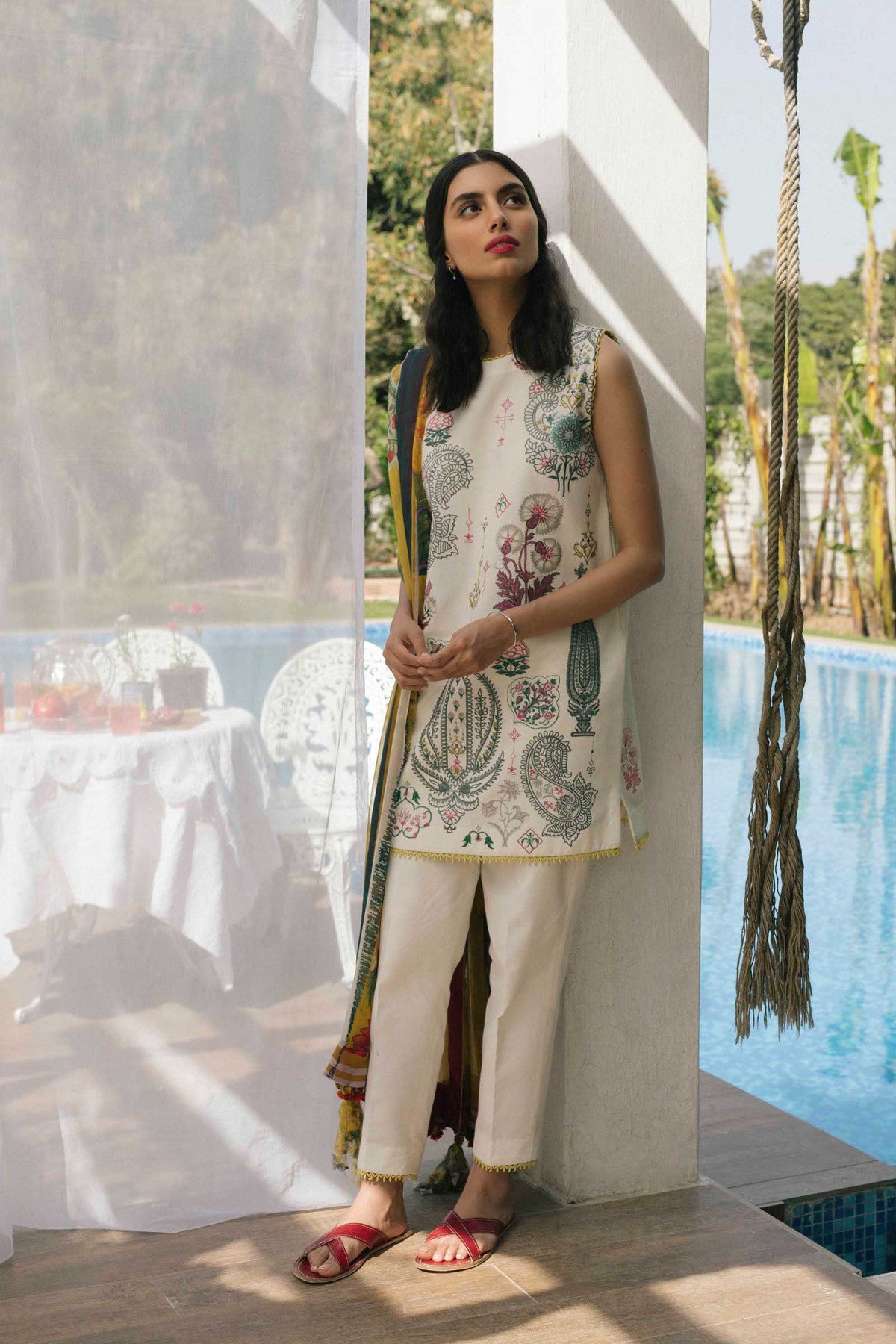 paired with a printed chiffon dupatta and dyed cambric trouser.