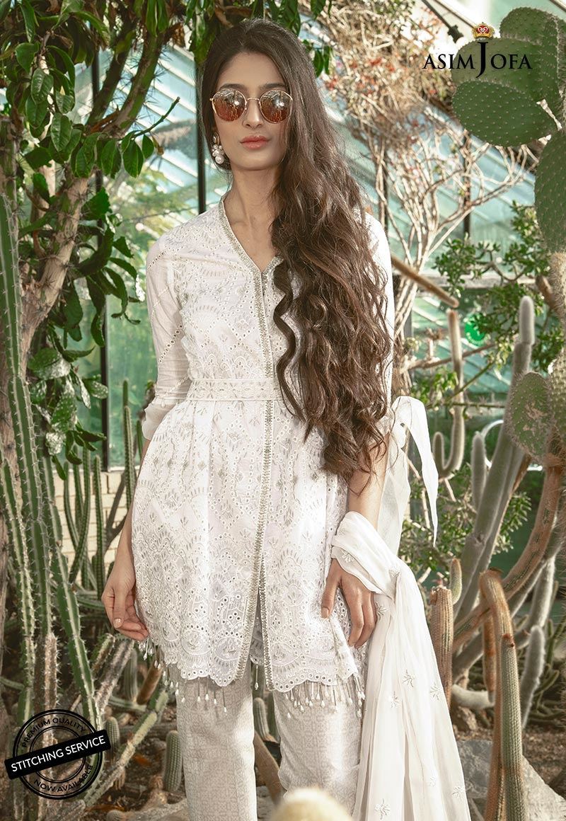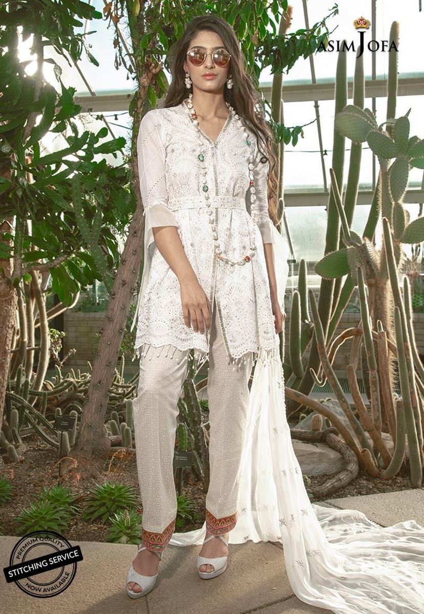 Ravishing white, a must have design to your closet, Chic fabric with the opalescent white on white engraved boring technique to combine and create the smoldering style statement for your 2019 summer. Paired with white self-printed pants and all over embroidered chiffon dupatta.