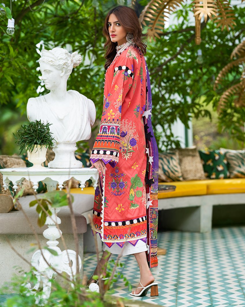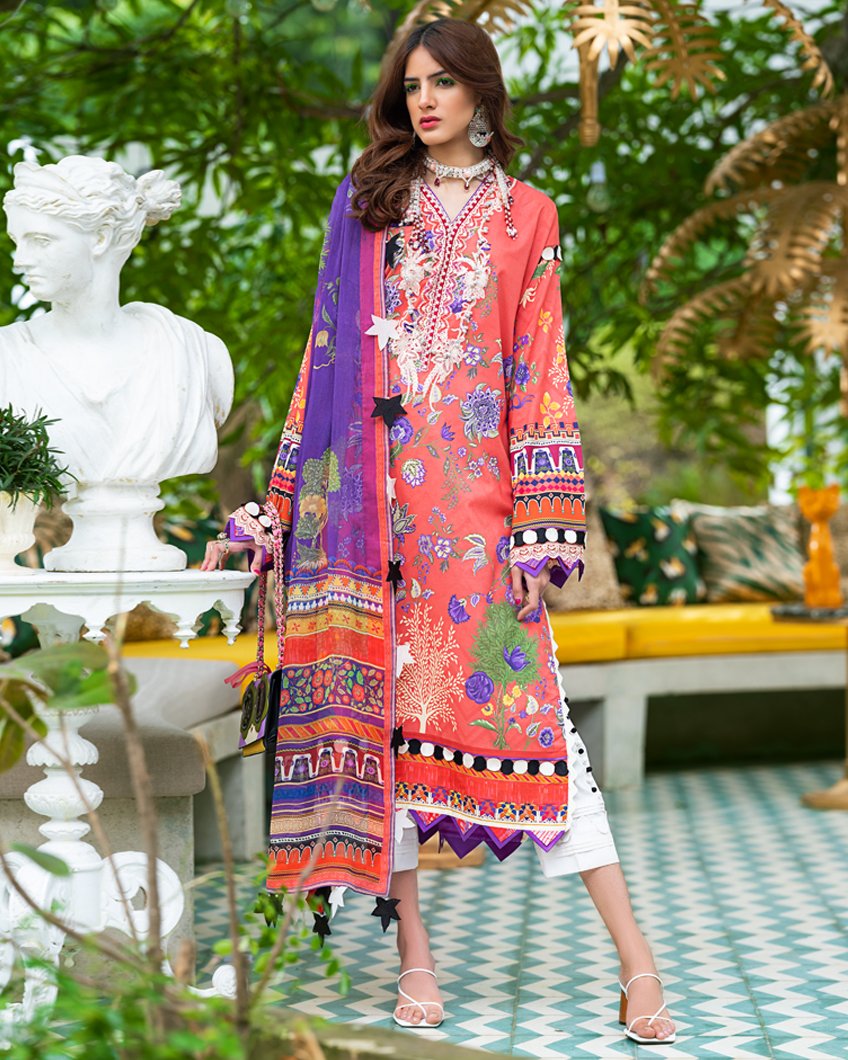 Shine bright in 'Anahi' with its striking blooms and vibrant colours of gorgeous coral and lustrous purple. Illustrative embroideries come together with a feminine print to create inimitable elegance while ensuring you stay current with the season's must have trends!