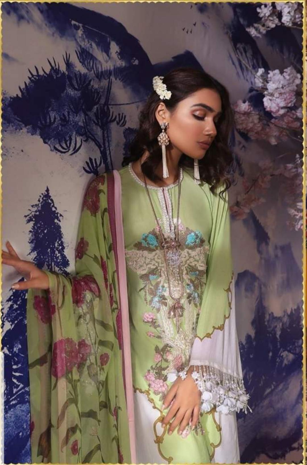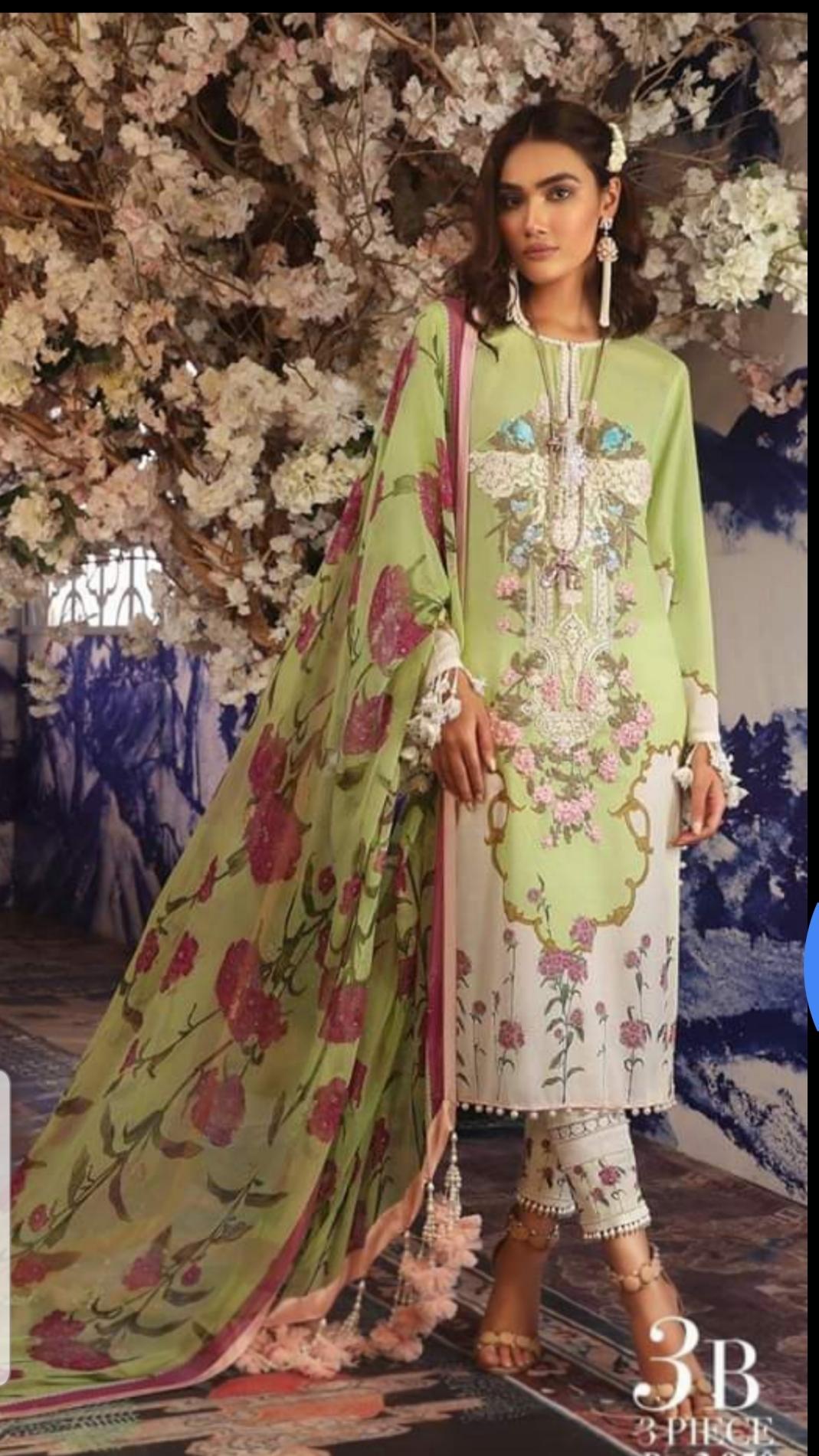 Digitally printed apple green hemmed with pink embroidered flowers, this lawn shirt has color-blocking offset by a beautiful neck featuring silk-thread embroidery on organza. Comes with a printed back and sleeves and a delicate floral chiffon-blend printed dupatta.