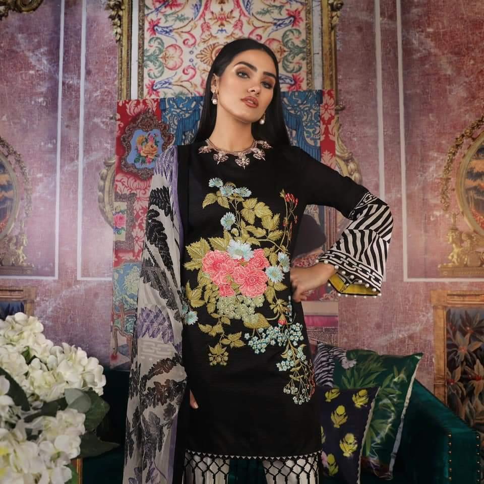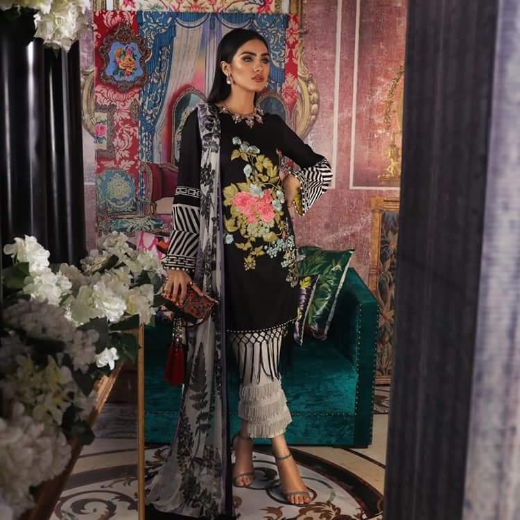 A jet black lawn shirt with a peach and olive embroidered floral hem and a monochromatic border. Paired with a ferns print chiffon-blend dupatta.Code: 18A (Azure)