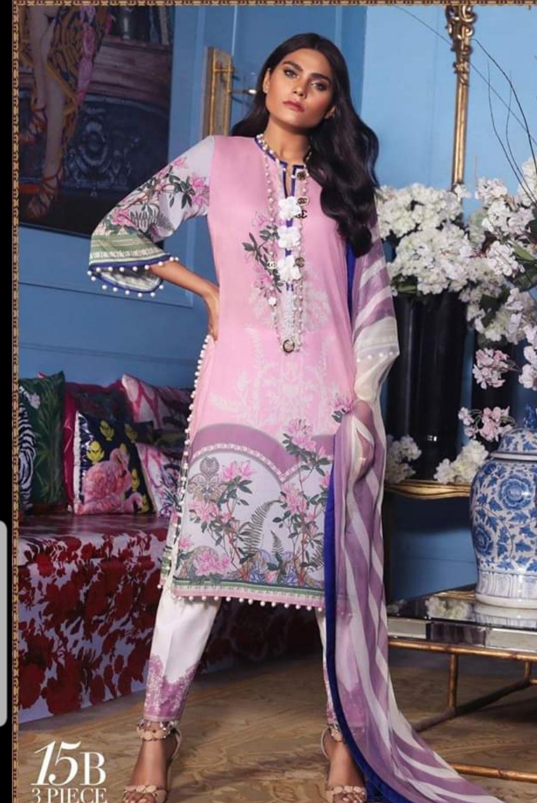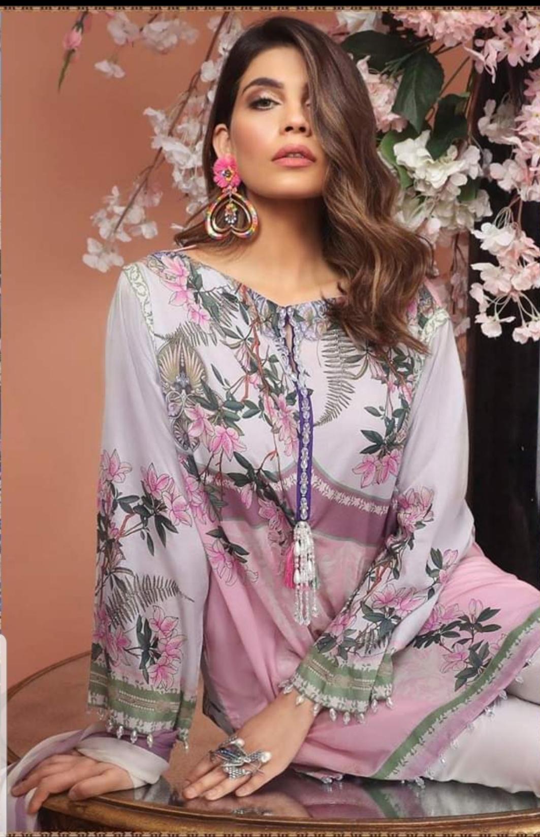 A blush pink with cream modern floral digitally printed lawn shirt with Mughal patterns and a modern monochromatic printed blend-chiffon dupatta.Code: 15B (Blush Dream)