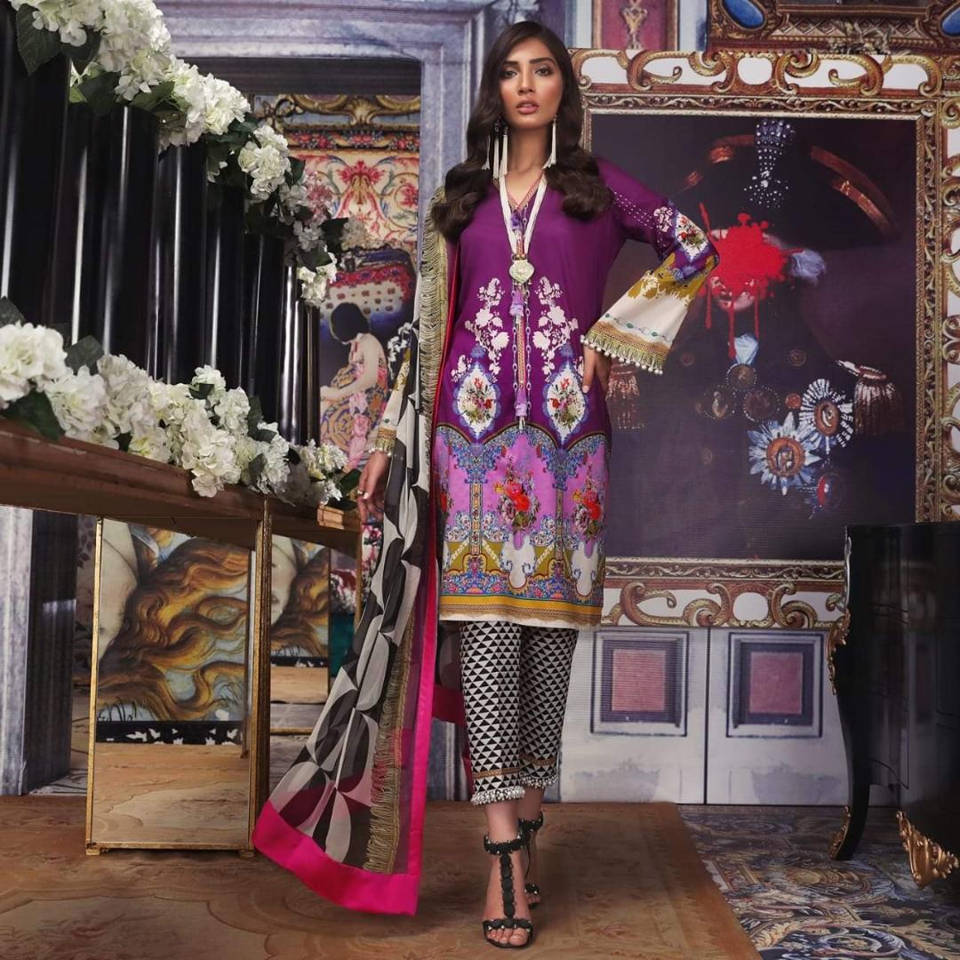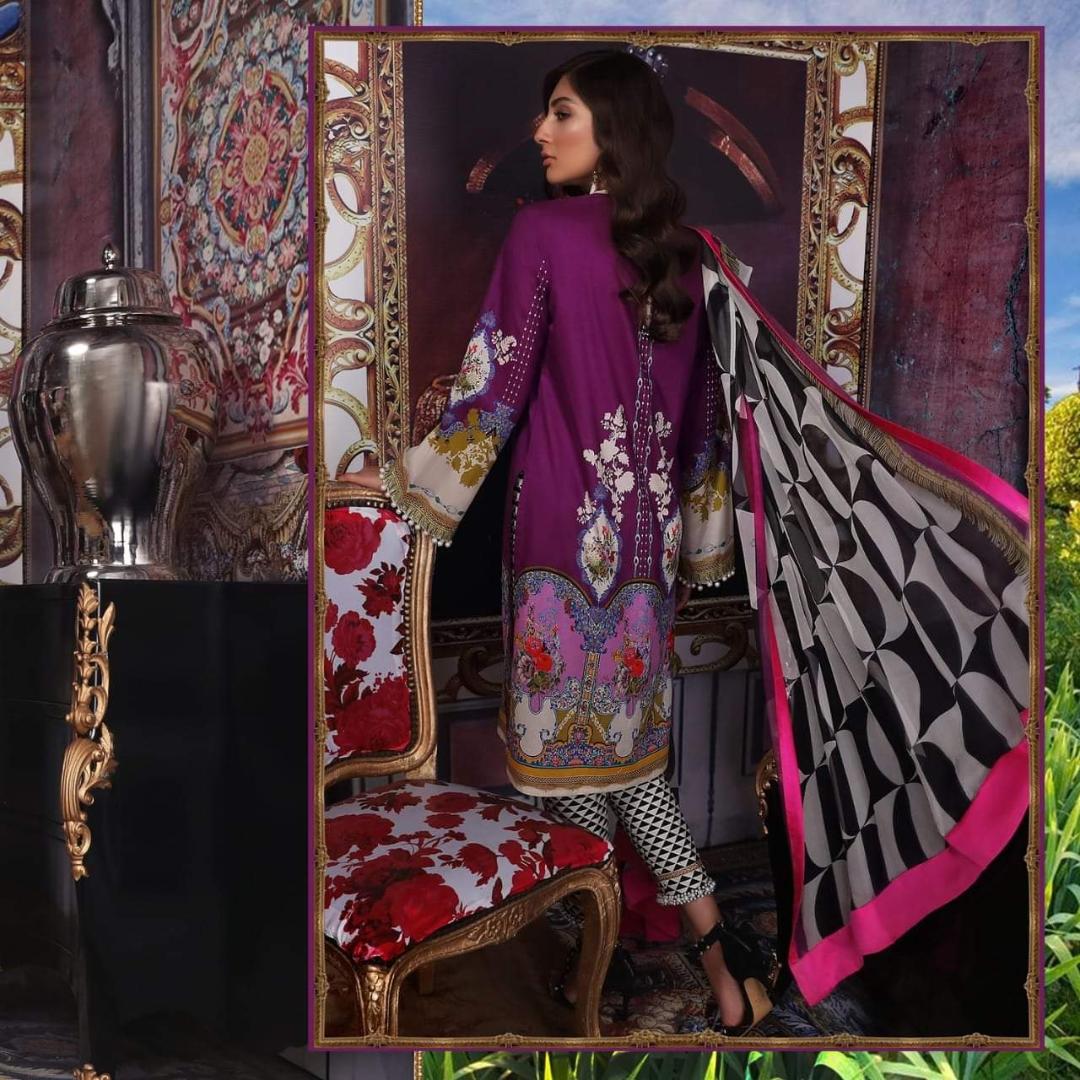 A digitally printed aubergine and lavender lawn shirt with a fusion of floral and Mughal print. Paired with a printed back and sleeves, monochromatic printed cotton pants and chiffon-blend dupatta.