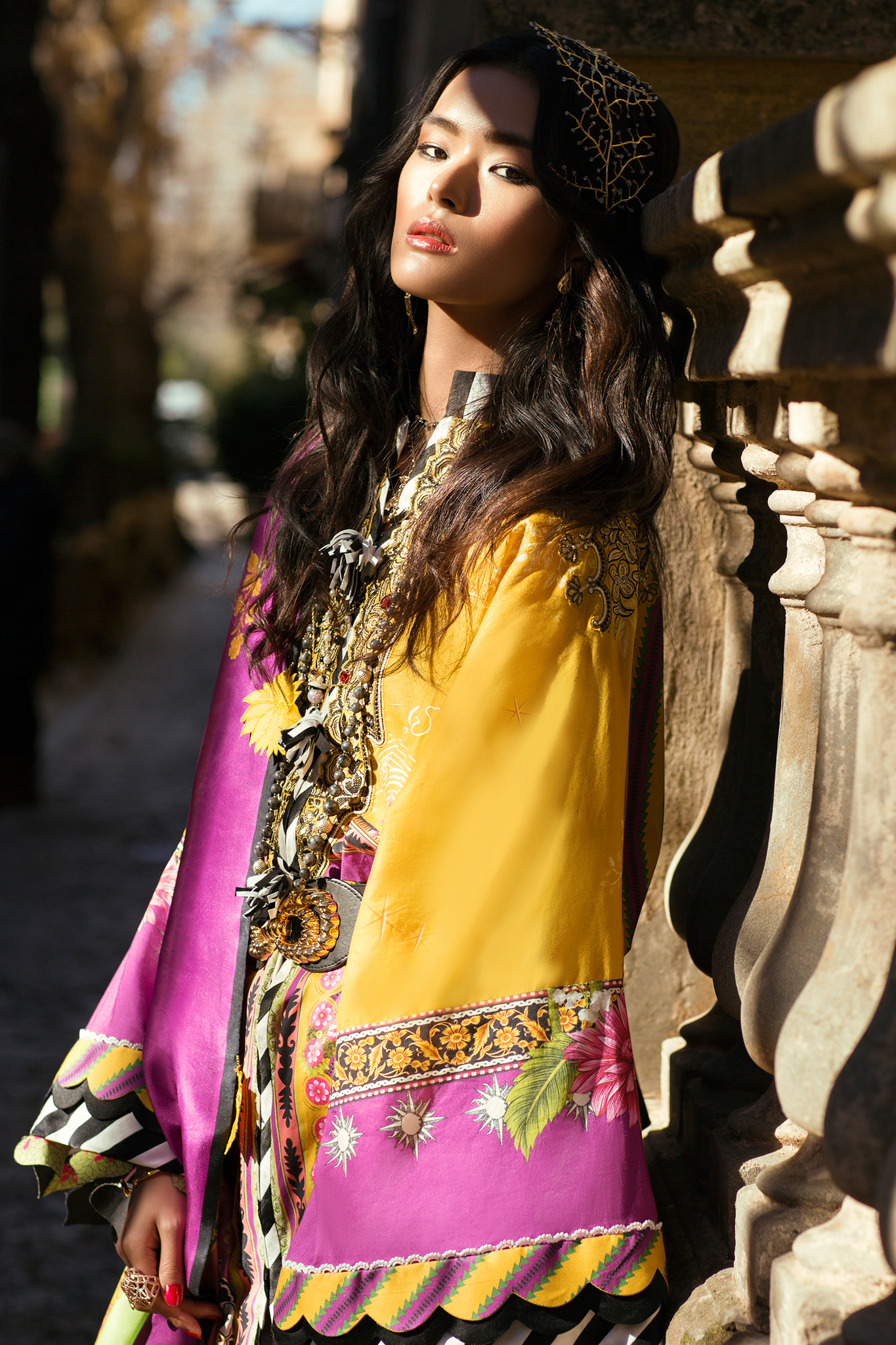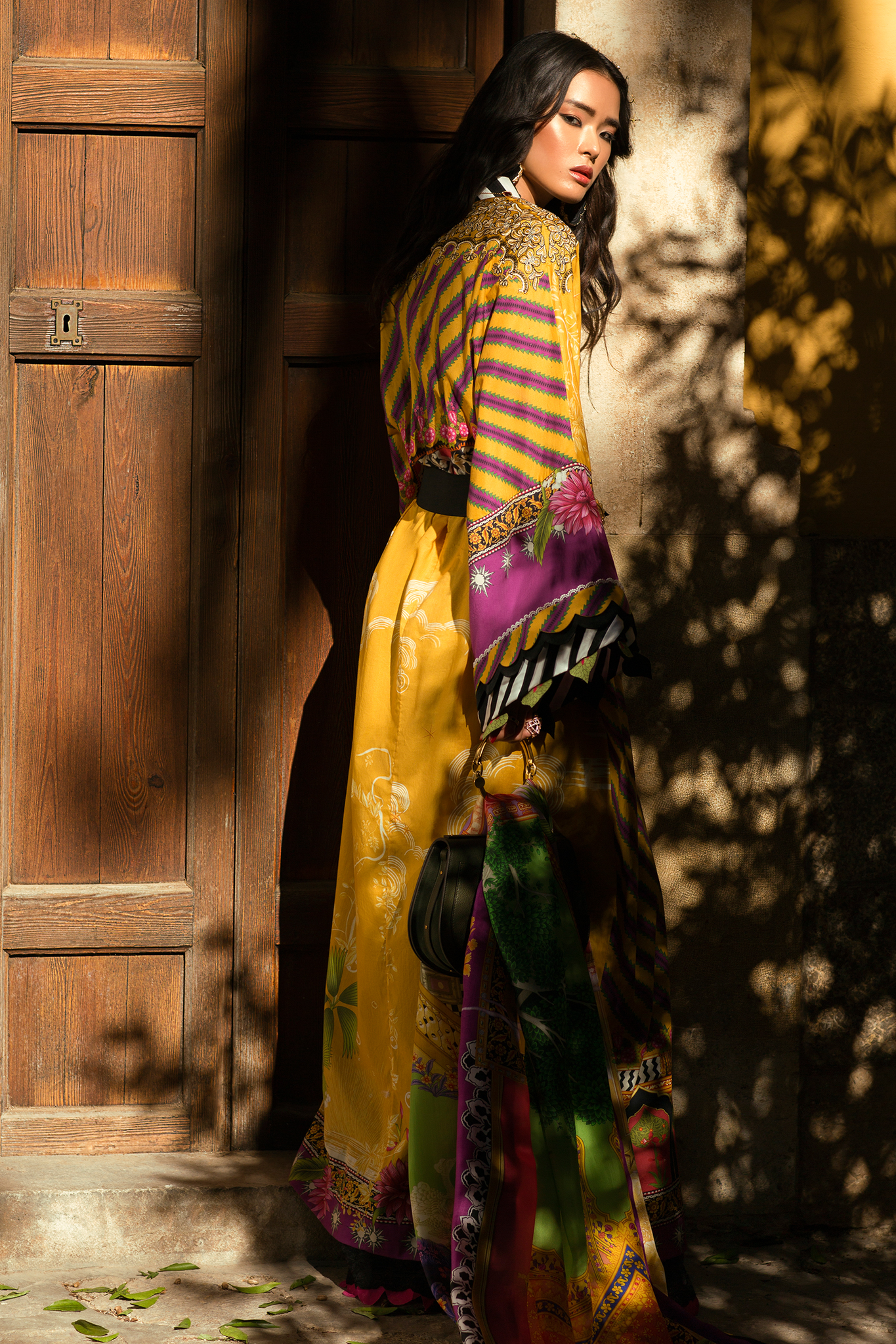 A mesmerising print blending eastern architectural elements with vivid floral motifs. 'Vivir' is brought to life in a rich saffron bolstered with pops of magenta and is accompanied by delicate embroideries and a lavish, illustrated silk dupatta featuring a Mughal dreamscape.