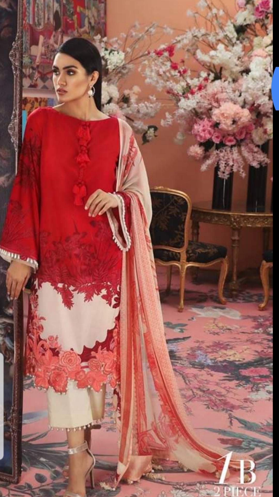 A printed lawn shirt with deep shades of red with color blocking offset by a peach silk-thread embroidered floral border and beautifully composed printed back and sleeves. Comes with a complementary chiffon-blend dupatta with patterns from the tree of life.