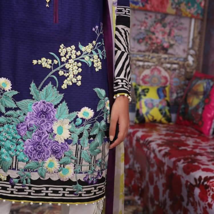 A Persian blue lawn shirt with a lavender and turquoise embroidered floral hem and a monochromatic border. Paired with ferns print chiffon-blend dupatta.Code: 18B (Persian Blue)