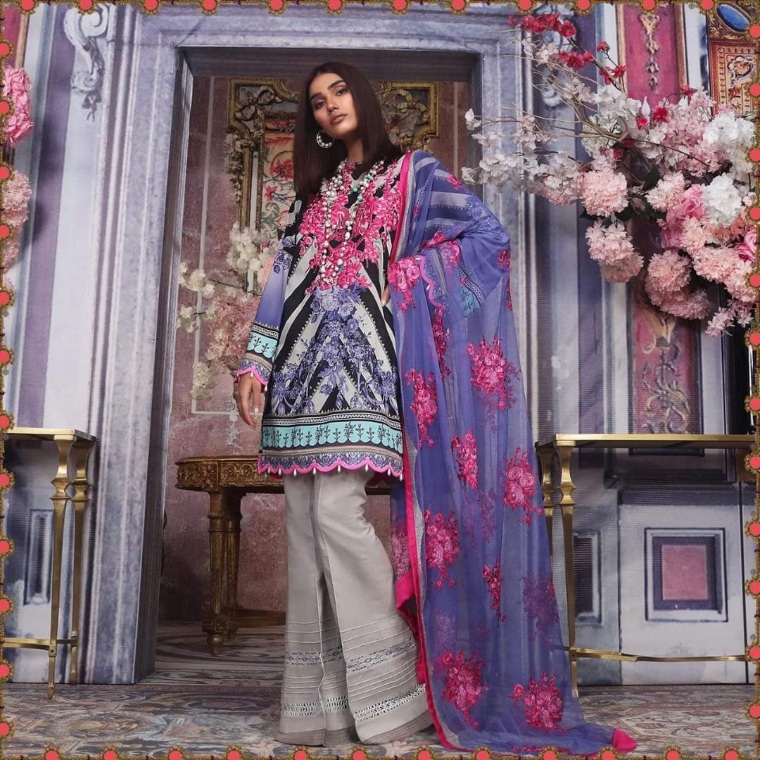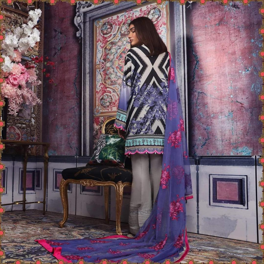 A digitally printed lawn shirt with a purple and cream geometric design with blue florals and a turquoise silk-thread embroidered neck on organza. Paired with a printed back and sleeves and a traditional buti embroidered dupatta on net.