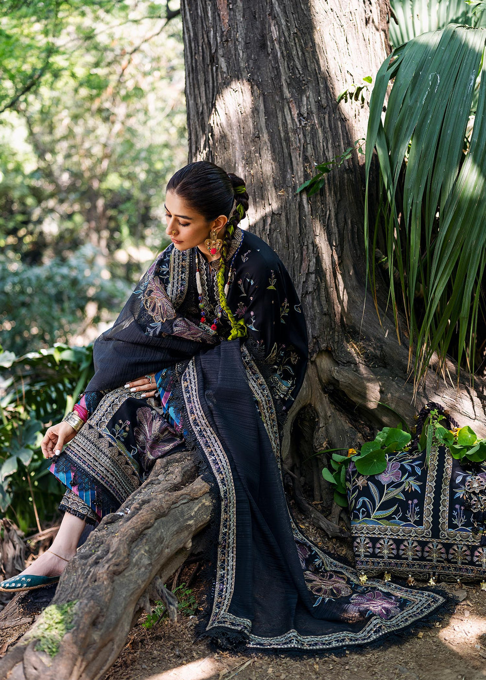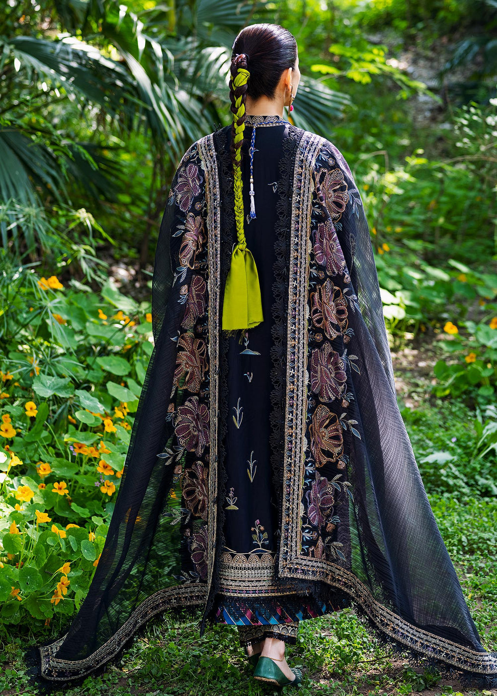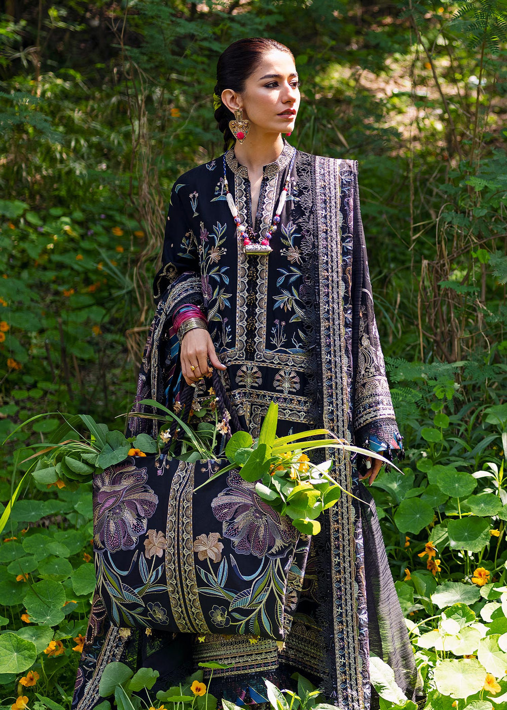 Description: Raat ki Rani is our kajal black hued festive lawn ensemble. The shirt features framed motifs of floral sprigs done in contrasting celestial shades in blue, purple, silver and greens and the hemline has rows of intricate patterns and chatapati trim . the sleeves too featured lyrical bunches of flowers and song birds The matching dupatta has contrasting thread embroidery running all across 4 sides elevated with chatapati accents. The ensemble is paired with a matching Shalwar with embroidery around the cuffs