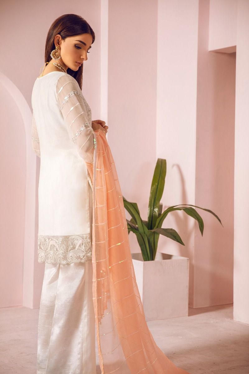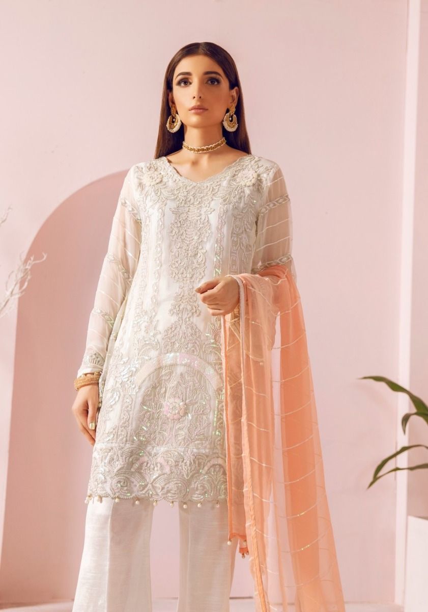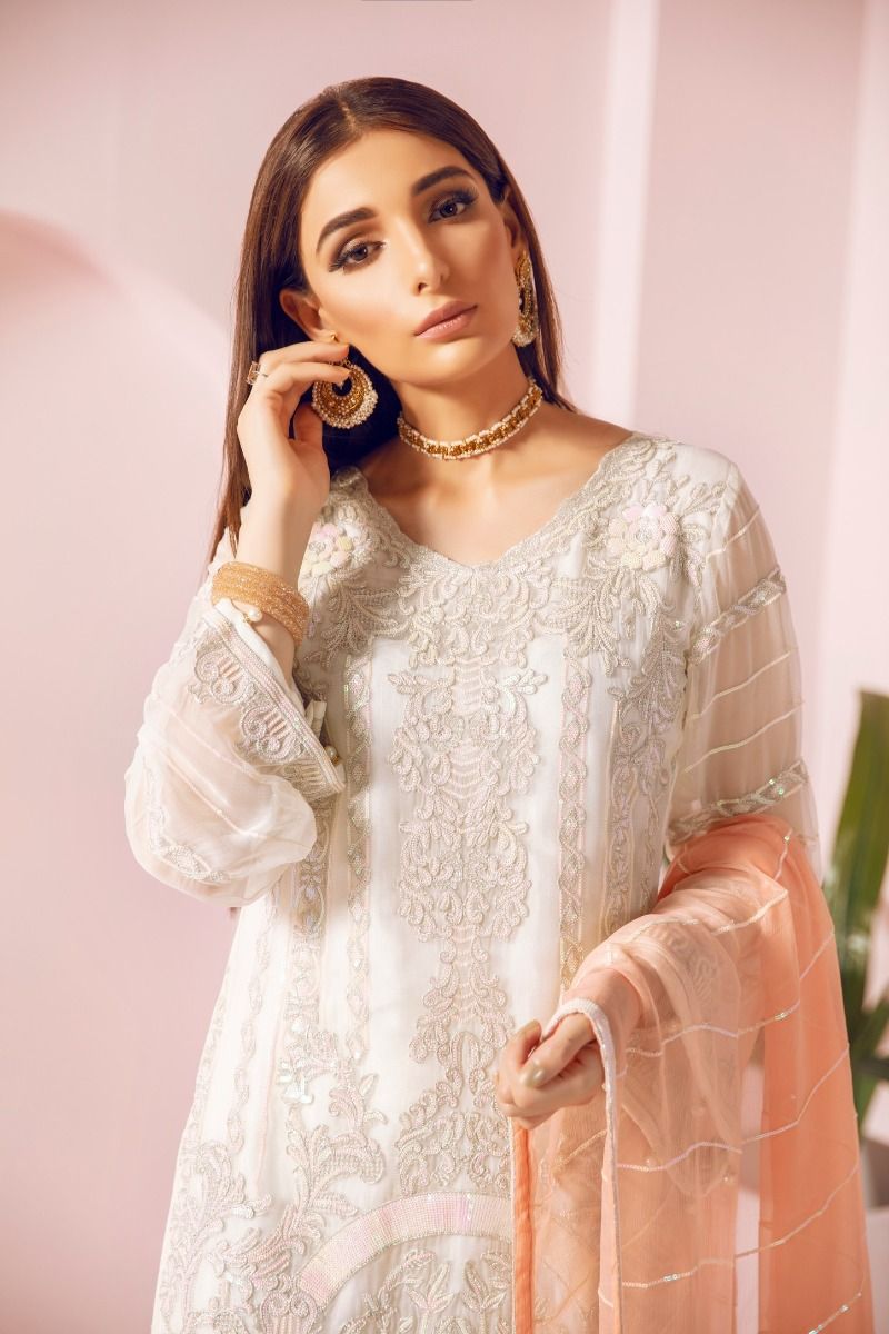 EMBROIDERED CHIFFON FRONT AND SLEEVES EMBROIDERED CHIFFON BACK AND DUPATTA EMBROIDERED DAMAN PATCH GRIP TROUSER AND ACCESSORIES