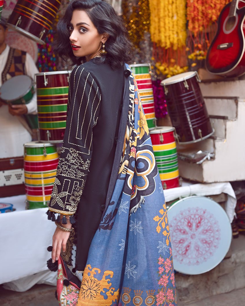 An effervescent design with intricate kantha stitch-work illustrating floral and geometric elements. 'Shahi Qila' is rendered in shadowy black, this look is accompanied by a rich and vibrant cotton net shawl in bold hues of cerulean and ochre.