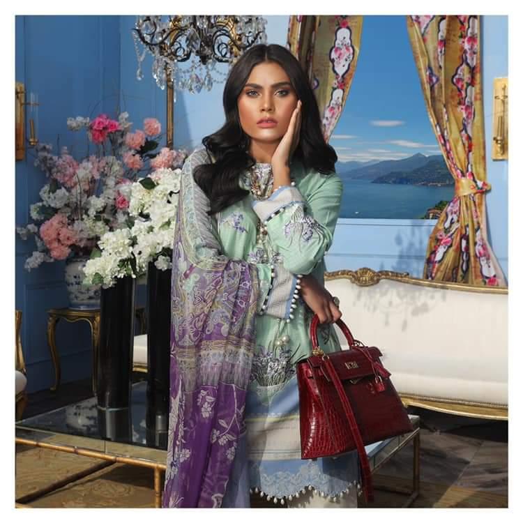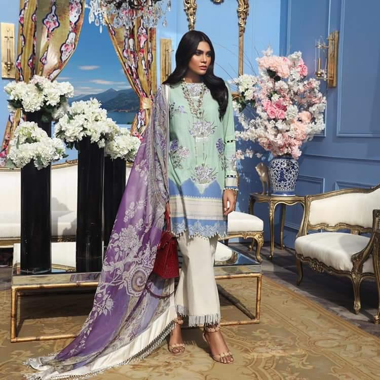An embroidered front with beautiful peach chrysanthemums on mint woven lawn with a bold gold printed border. Paired with a chiffon-blend printed dupatta.Code: 17B (Tranquility)