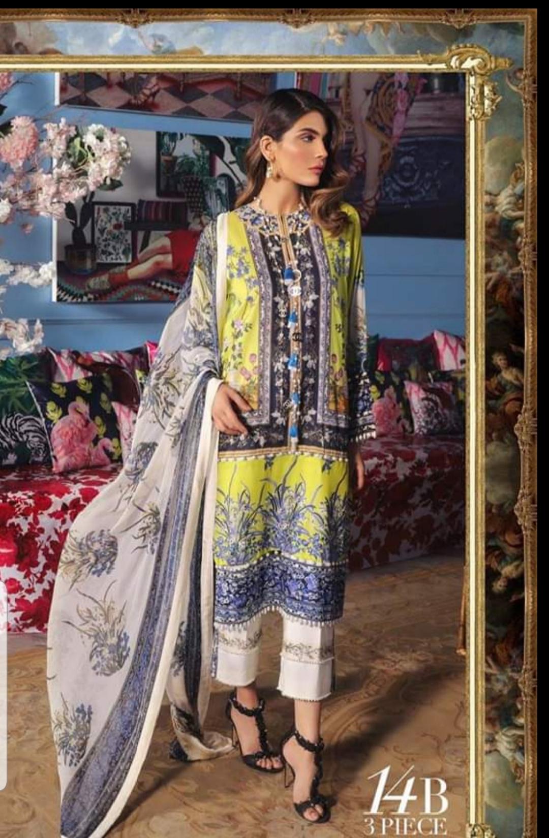 An embroidered acid yellow front with a Chinese design of blue florals paired with a digitally printed back and sleeves with a beautiful printed chiffon-blend dupatta.Code: 14B (Yellow Moon)
