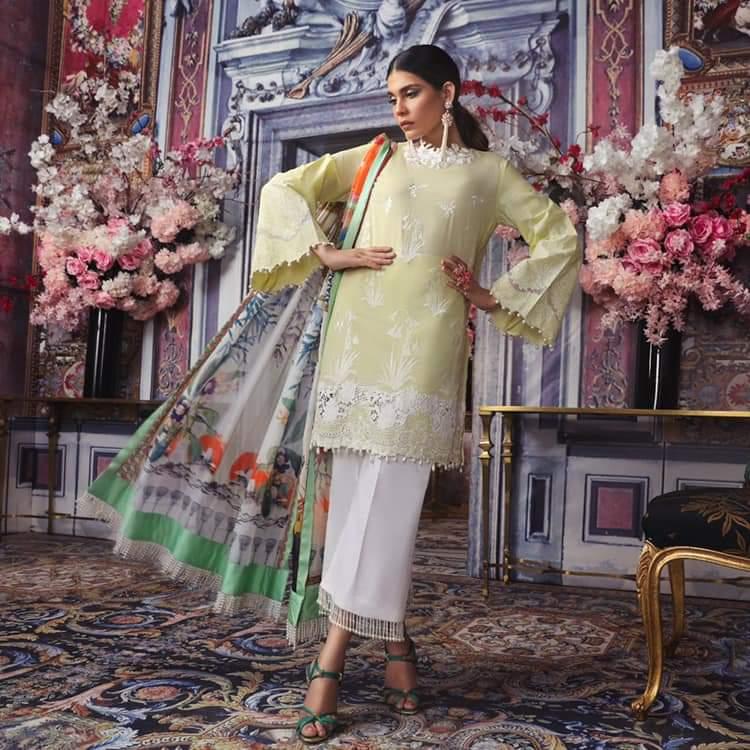 A pale yellow schiffli front French lace design lawn shirt offset by white floral patches silk-thread embroidered on organza. Paired with a printed back and sleeves with a modern complementary multicolored silk –blend digitally printed poly dupatta.Code: 20A (Zest)